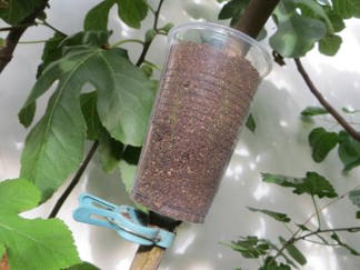 Nun Blumenerde in den Becher und etwas festdrücken.