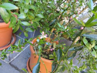 Zitruspflanzen: sehr dornenbewehrt und dicht belaubt mit vielen kleinen, rundlichen Blättern. Und so robust wie sie