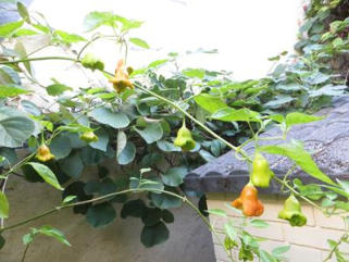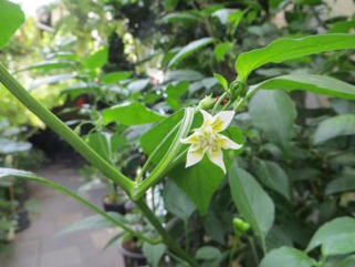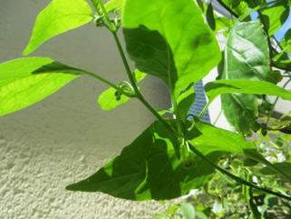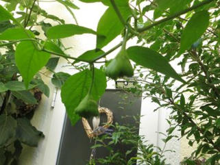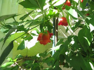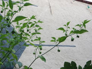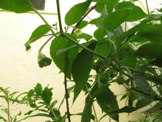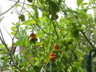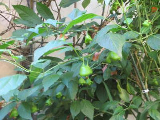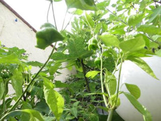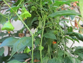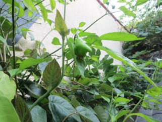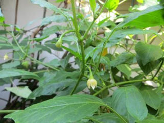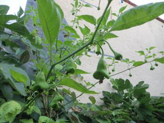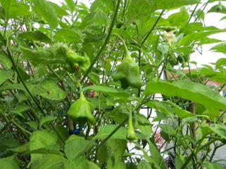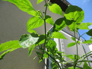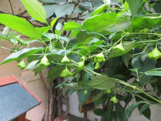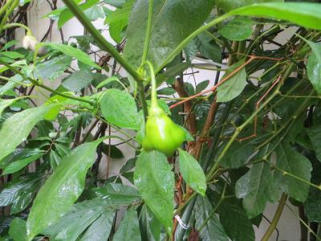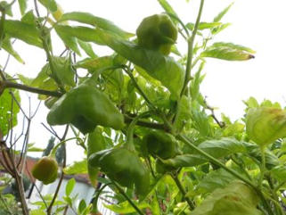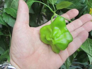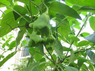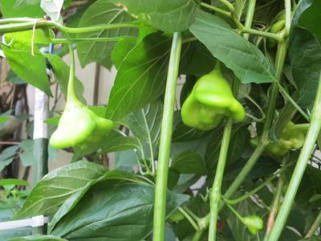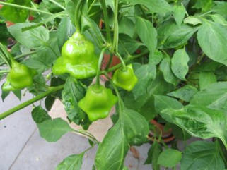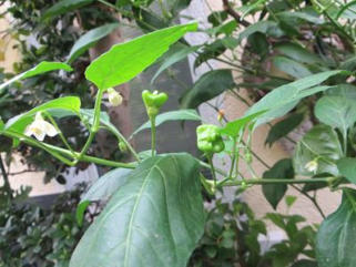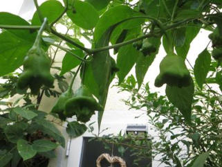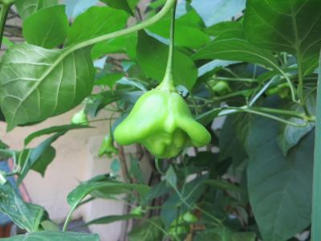 Zu meiner Verwunderung kamen nach der Blüte ganz andre Chilis heraus. Sie waren grün und hatten eine Glockenform mit Klöppel unten.