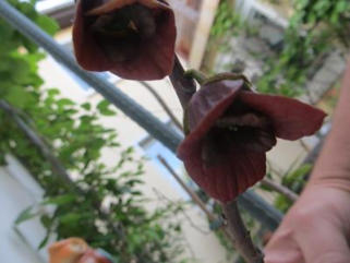 cm langen, hellgrünen, dünnen Blätter färben sich im Herbst goldgelb. Die kastanienbraunen bis purpurfarbenen Blüten