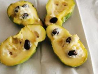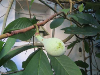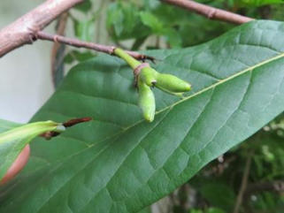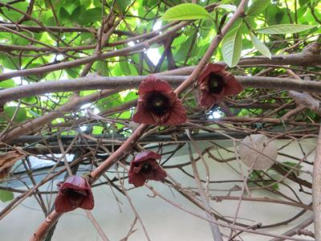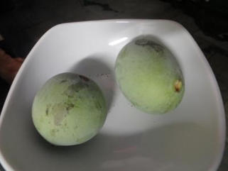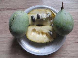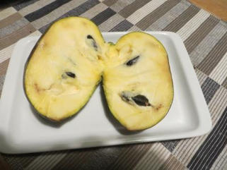 vergleichbar ist und an Rahmäpfel (Annona) erinnert. Die Konsistenz des Fruchtfleisches erinnert an Bananen.Die im