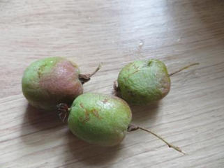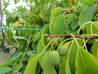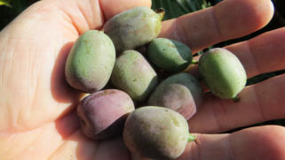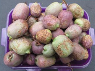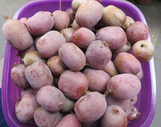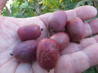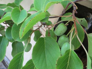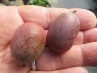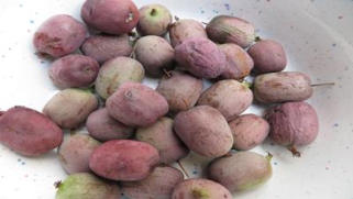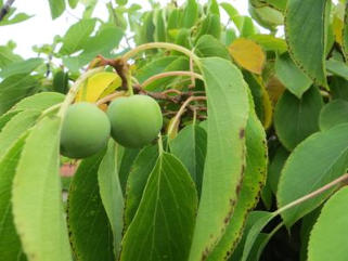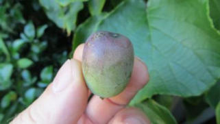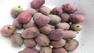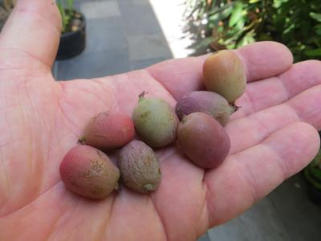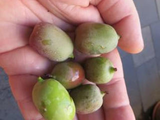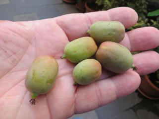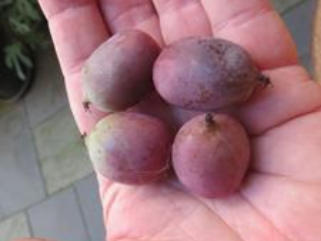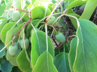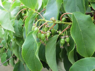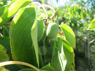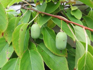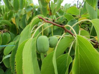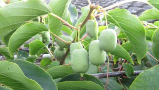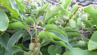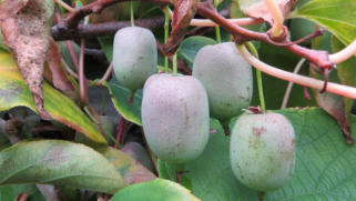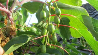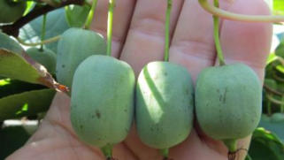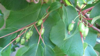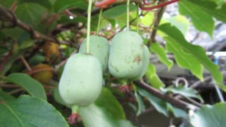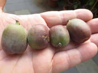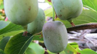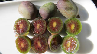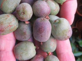 Früchteertrag. Die Früchte sind ohne die gewohnte Pelz Haut bei Kiwis. Die Größe ist bei beiden Arten recht klein etwa die